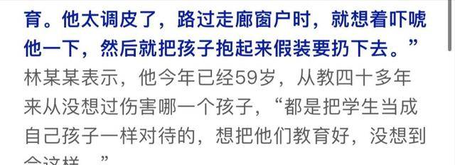 为了不影响其他同学继续上课,林老师强压着怒火,决定带陈某某去办公室进行教育,当他们走出教室,来到走廊时,林老师一把将陈某某抱到窗口旁边,让孩子的上半身处于悬空状态。